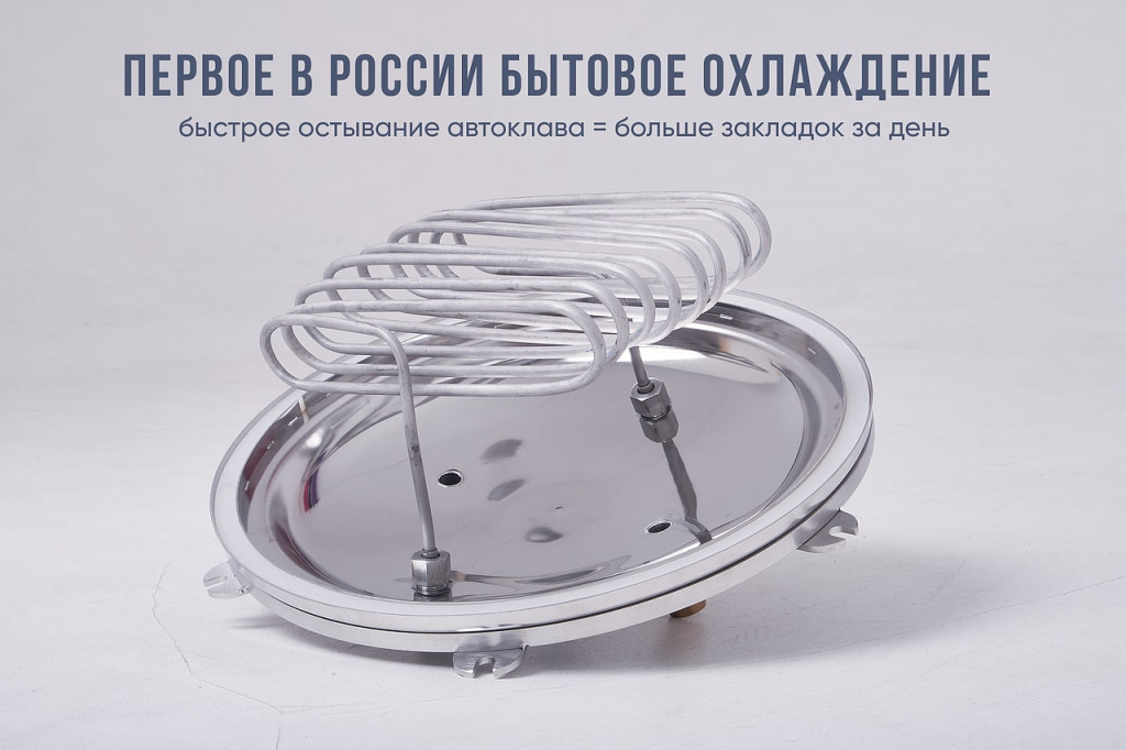 Вместе с автоклавом, вы получаете устройство для быстрого охлаждения автоклава. Это особенно удобно, если вы готовите в реторт пакетах. Новую партию можно будет загрузить ещё быстрее, чем раньше.