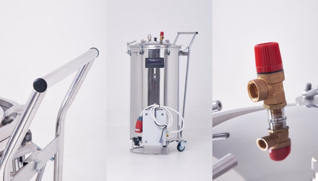 Электрический автоклав из нержавеющей стали с полностью автоматизированным процессом стерилизации. Оснащен электрическим блоком управления (ЭБУ) с возможностью стерилизации в 4 автоматических режимах "Мясо", "Птица", "Рыба", "Компот". В автоклаве предусмотрены автоматические режимы для жестяных банок и реторт-пакетов. Есть возможность сохранения до 10 собственных программ стерилизации для каждого вида упаковки.
