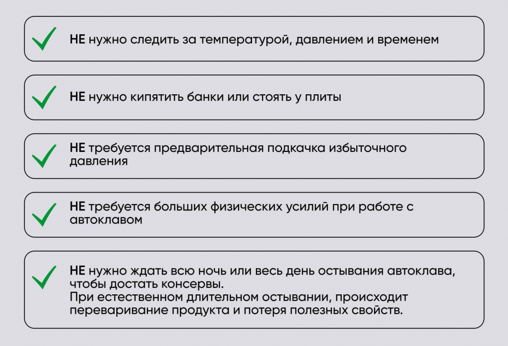 • Не нужно несколько часов стоять у плиты и закатывать горячие банки. Контакт с кипятком полностью исключен.